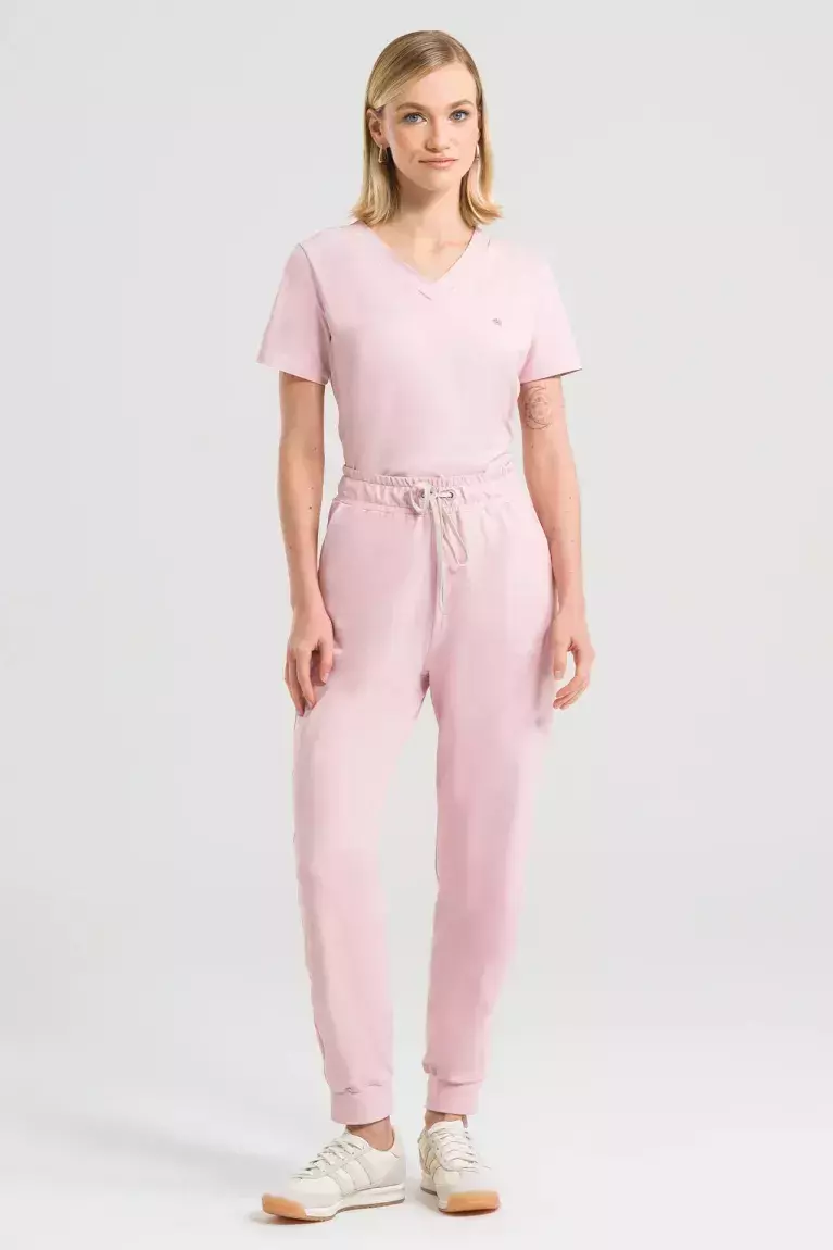 Com blusa de gola em “V” e mangas curtas, e calça com elástico na cintura, cadarço regulador e bolsos laterais funcionais, o modelo traz praticidade e um caimento moderno. O detalhe no tornozelo ajustado proporciona maior segurança e liberdade de movimento.
